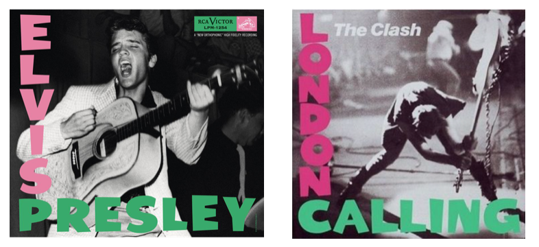 I've always loved Elvis' first album (1956) because it showcased his raw, unpolished talent before he became a commercialized icon. The black and white photo of him belting out a song on his acoustic guitar is powerful and the logo is bold, fun, and unexpected. Later these aesthetics were echoed by others including the Clash with their iconic 1979 album London Calling. So when I was searching for a font, this seemed like a natural.